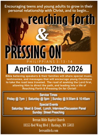 Teens, Young Adults, and Their Parents face many challenges today. Some of the toughest are as they learn to navigate building a personal relationship with the Lord. With that, they must start to think about leaving home, careers, relationships that may lead to marriage and a family of their own, and allowing the LORD (rather than the world) to direct their path. This special meeting is aimed at addressing these topics. Join us as we have invited a unique group of speakers, and their families, as they share testimonies and bring messages that will encourage young people to begin Reaching Forth & Pressing On in living a life for the Lord!
